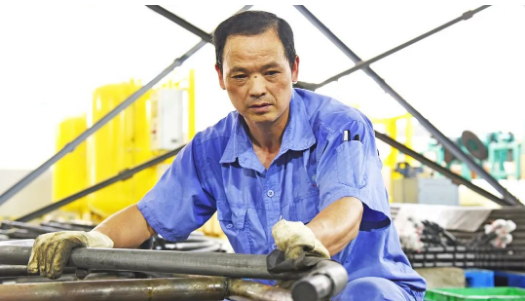 高壓油管車間,汗流浹背的操作工人正在操作彎管機(jī)加工高壓油管。