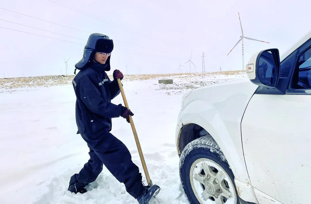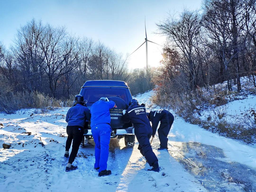 進(jìn)入11月,內(nèi)蒙古自治區(qū)錫林郭勒盟地區(qū)迎來大面積的暴風(fēng)雪,烏達(dá)萊項(xiàng)目人員在趕往風(fēng)場的路上遭遇積雪路段,雖然氣候嚴(yán)寒,但為了及時(shí)消除機(jī)組故障,大家在積雪路段采取挖雪推車的方式齊心協(xié)力,一同開展清理路面積雪的行動(dòng)。這個(gè)冬日,冰雪阻擋不住海裝追風(fēng)者們勇往直前的步伐,他們只為恪盡職守完成一個(gè)承諾——風(fēng)機(jī)旋轉(zhuǎn)、帶來光熱。