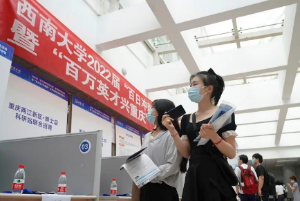 圖片▲在位于重慶市北碚區(qū)的西南大學(xué),應(yīng)屆畢業(yè)生參加“百萬(wàn)英才興重慶”招聘會(huì)(2022年5月13日攝)。用人單位提供了涉及教育、人工智能、汽車制造等領(lǐng)域的3000多個(gè)崗位供畢業(yè)生選擇。新華社發(fā)(秦廷富 攝)