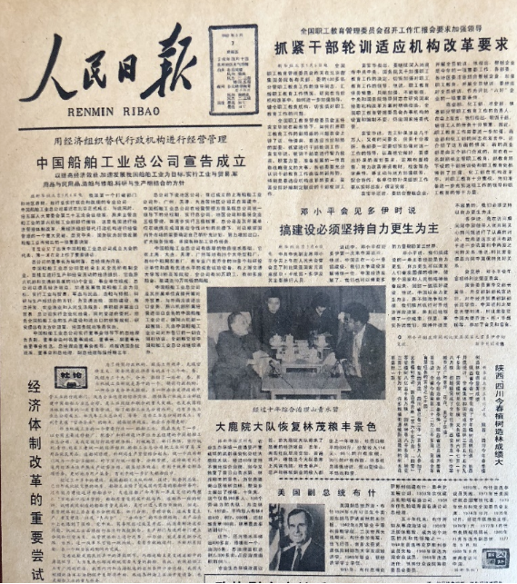 “改革開放是決定當(dāng)代中國命運(yùn)的關(guān)鍵一招?!?982年5月7日《人民日報(bào)》頭版刊載文章:“用經(jīng)濟(jì)組織替代行政機(jī)構(gòu)進(jìn)行經(jīng)營管理——中國船舶工業(yè)總公司宣布成立”,標(biāo)題下文又著重強(qiáng)調(diào)“以提高經(jīng)濟(jì)效益,加速我國船舶工業(yè)為目標(biāo),實(shí)行工業(yè)與貿(mào)易,軍用品與民用品,造船與修船,科研與生產(chǎn)相結(jié)合的方針”。頭版還發(fā)表了以“經(jīng)濟(jì)體制改革的重要嘗試”為標(biāo)題的“社論”。在這期《人民日報(bào)》的頭版還刊發(fā)了鄧小平同志接待外賓時(shí)的講話“搞建設(shè),必須堅(jiān)持自力更生為主”。