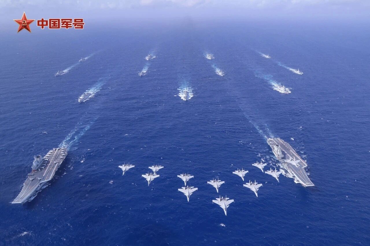 2024年10月,遼寧艦、山東艦編隊首次開展雙航母編隊演練。殲-15戰(zhàn)機(jī)組成楔形編隊飛過雙航母編隊上空。
