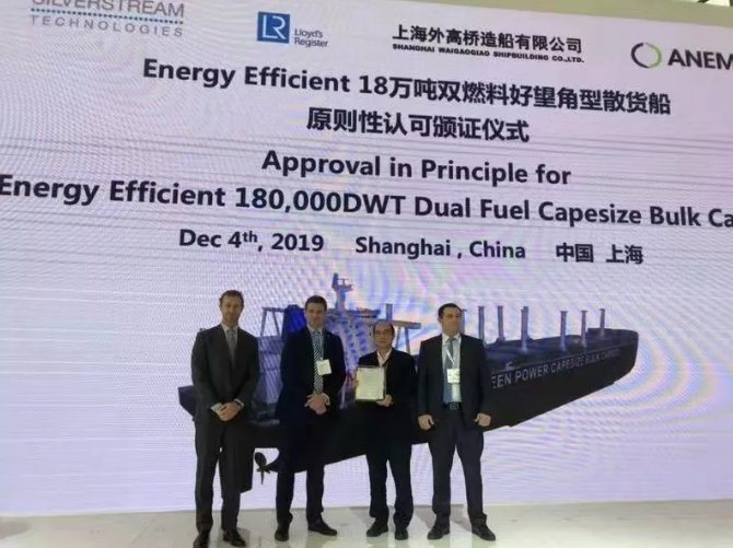 ????12月4日,中國船舶集團(tuán)所屬上海外高橋造船有限公司隆重推出兩款集多種節(jié)能環(huán)保技術(shù)于一身的“Energy Efficient”18萬噸級雙燃料好望角型散貨船和30萬噸級雙燃料超大型原油船新船型。展會上,英國勞氏船級社為18萬噸級雙燃料好望角型散貨船頒發(fā)了AiP證書;英國勞氏船級社和美國船級社為30萬噸級雙燃料超大型原油船頒發(fā)了AiP證書。