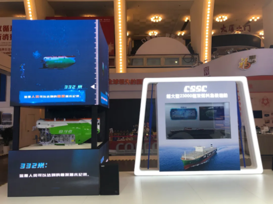 進入中國船舶展廳,觀眾不僅能夠看到“奮斗者”號全海深載人潛水器、“雪龍2”號極地科考船等多個高科技品牌產(chǎn)品,還可以通過航空母艦、常規(guī)動力潛艇、驅(qū)逐艦、護衛(wèi)艦模型了解我國國防裝備實力。