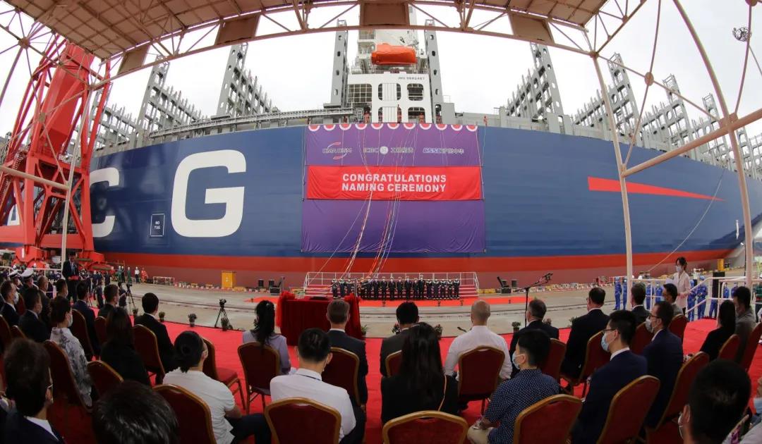 8月27日,由中國(guó)船舶集團(tuán)有限公司旗下滬東中華聯(lián)合中船貿(mào)易為法國(guó)達(dá)飛海運(yùn)集團(tuán)建造的15000TEU超大型集裝箱系列船首制船“達(dá)飛·和風(fēng)”號(hào)命名交付。這是中法兩國(guó)船海巨頭全面落實(shí)2019年中國(guó)國(guó)家主席習(xí)近平和法國(guó)總統(tǒng)馬克龍見(jiàn)證簽署的戰(zhàn)略合作框架協(xié)議的最新成果。同時(shí),也標(biāo)志著“CSSC超大型箱船譜系”又添“新丁”,實(shí)現(xiàn)了對(duì)全球超大型集裝箱船發(fā)展的引領(lǐng)。