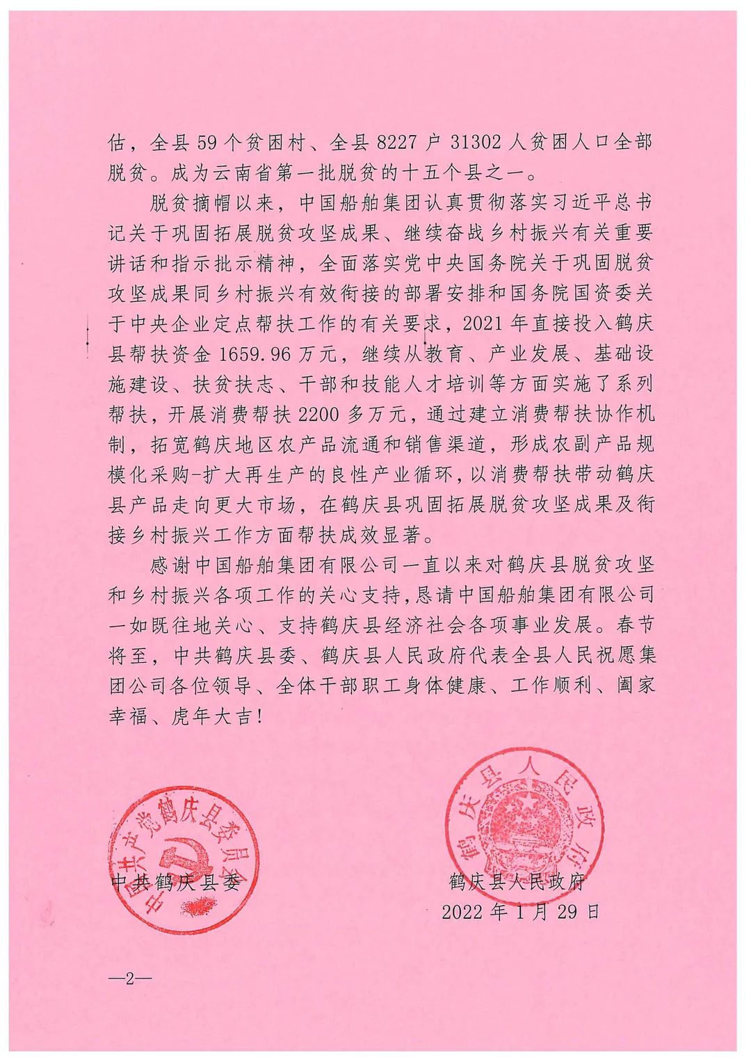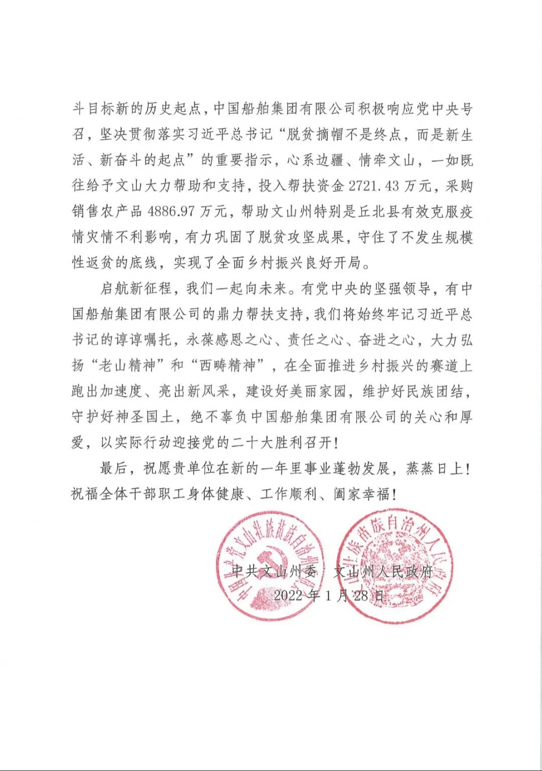 春節(jié)前夕,中國船舶集團陸續(xù)收到云南省委省政府、文山州委州政府、鶴慶縣委縣政府、勐臘縣政府發(fā)來的感謝信,對集團公司長期以來給予鶴慶縣、勐臘縣、丘北縣的傾力幫扶表示衷心感謝和崇高敬意。