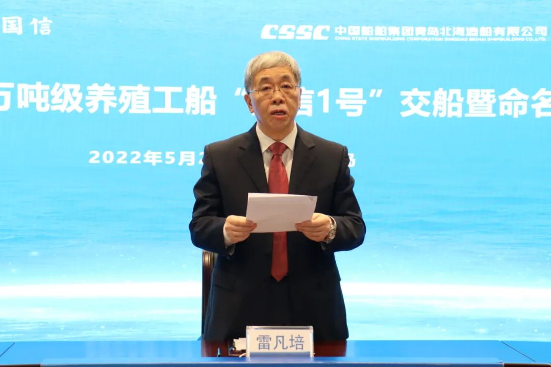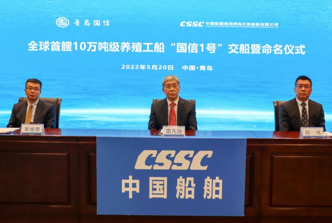 5月20日,中國(guó)船舶集團(tuán)旗下青島北海造船有限公司為青島國(guó)信發(fā)展(集團(tuán))有限責(zé)任公司建造的全球首艘10萬噸級(jí)智慧漁業(yè)大型養(yǎng)殖工船“國(guó)信1號(hào)”交船命名儀式在青島舉行。中國(guó)船舶集團(tuán)黨組書記、董事長(zhǎng)雷凡培,黨組成員、副總經(jīng)理孫偉通過視頻出席儀式,山東省人民政府黨組成員、副省長(zhǎng)凌文,青島市委副書記、市長(zhǎng)趙豪志,中國(guó)海洋大學(xué)黨委副書記、校長(zhǎng)于志剛,中國(guó)工程院院士麥康森等領(lǐng)導(dǎo)和嘉賓出席儀式。青島市副市長(zhǎng)趙燕為新船命名。