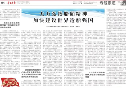 11月23日,中共中央黨校主辦的以思想理論宣傳為主旨的中央級大報《學習時報》刊發(fā)了中國船舶集團有限公司黨組副書記、總經(jīng)理楊金成署名文章《大力弘揚船舶精神 加快建設世界造船強國》。