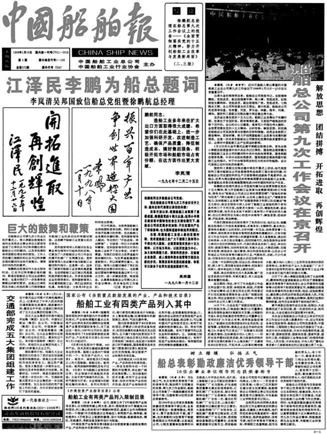1998年1月16日,《中國船舶報》報道江澤民、李鵬為中國船舶工業(yè)總公司題詞。