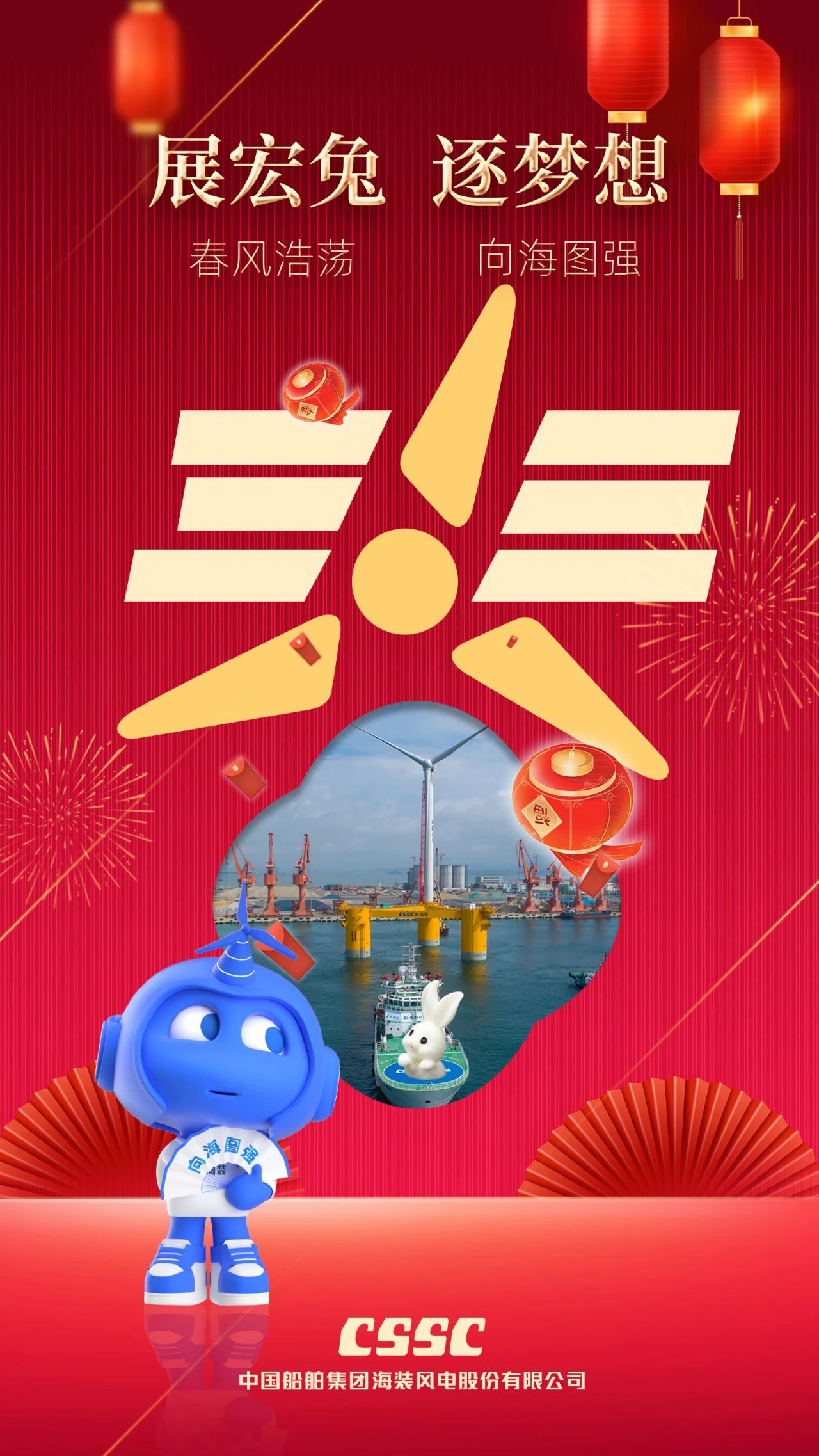 海報(bào)主體部分以國(guó)內(nèi)首臺(tái)深遠(yuǎn)海浮式風(fēng)電裝備“扶搖號(hào)”為創(chuàng)意點(diǎn),通過(guò)含有“大風(fēng)車”形象的寫意“春”字,表達(dá)中船海裝將在春風(fēng)浩蕩中大展宏“兔”,在向海圖強(qiáng)征程中矢志奮斗!