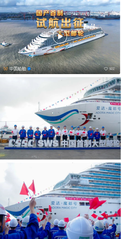 7月17日清晨7時許,隨著中國船舶集團有限公司黨組書記、董事長溫剛一聲令下,白色涂裝、流線型船體、身系“敦煌飛天彩帶”的首艘國產(chǎn)大型郵輪“愛達·魔都號”緩緩駛出中國船舶集團外高橋造船4號碼頭,正式出海試航。集團公司黨組成員、副總經(jīng)理盛紀綱出席試航出征儀式并致辭。