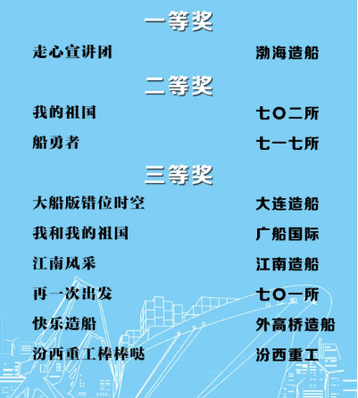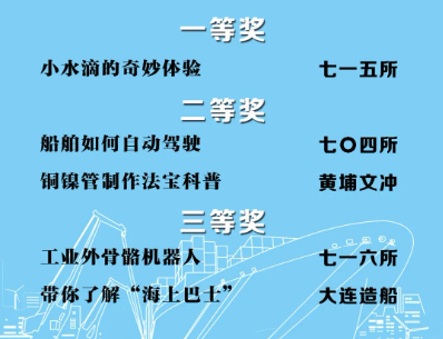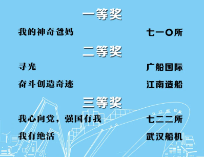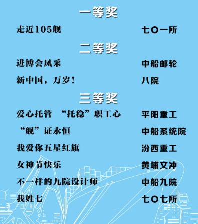 由中國船舶集團(tuán)黨群工作部指導(dǎo),中國船舶集團(tuán)新聞宣傳中心/中國船舶報(bào)社承辦的中國船舶集團(tuán)第二屆短視頻大賽圓滿落幕。經(jīng)過前期篩選,網(wǎng)絡(luò)投票,并特邀國務(wù)院國資委新聞中心、國防科工局新聞宣傳中心、中央電視臺、微博政務(wù)、中國船舶集團(tuán)黨群工作部專家評審,大賽最終評出一等獎5部,二等獎10部,三等獎23部,同時(shí)評出優(yōu)秀組織獎單位6家。名單如下,快來圍觀!