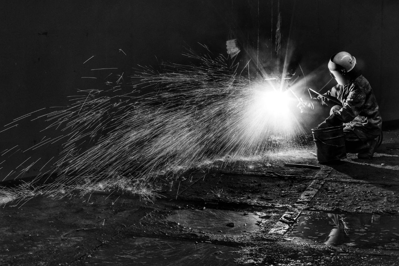 利用慢門記錄造船工人在氣刨時的工作場面。