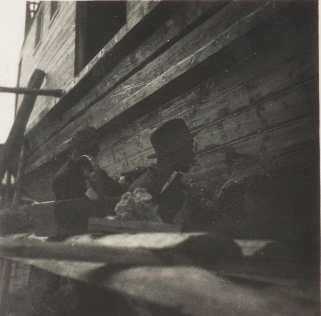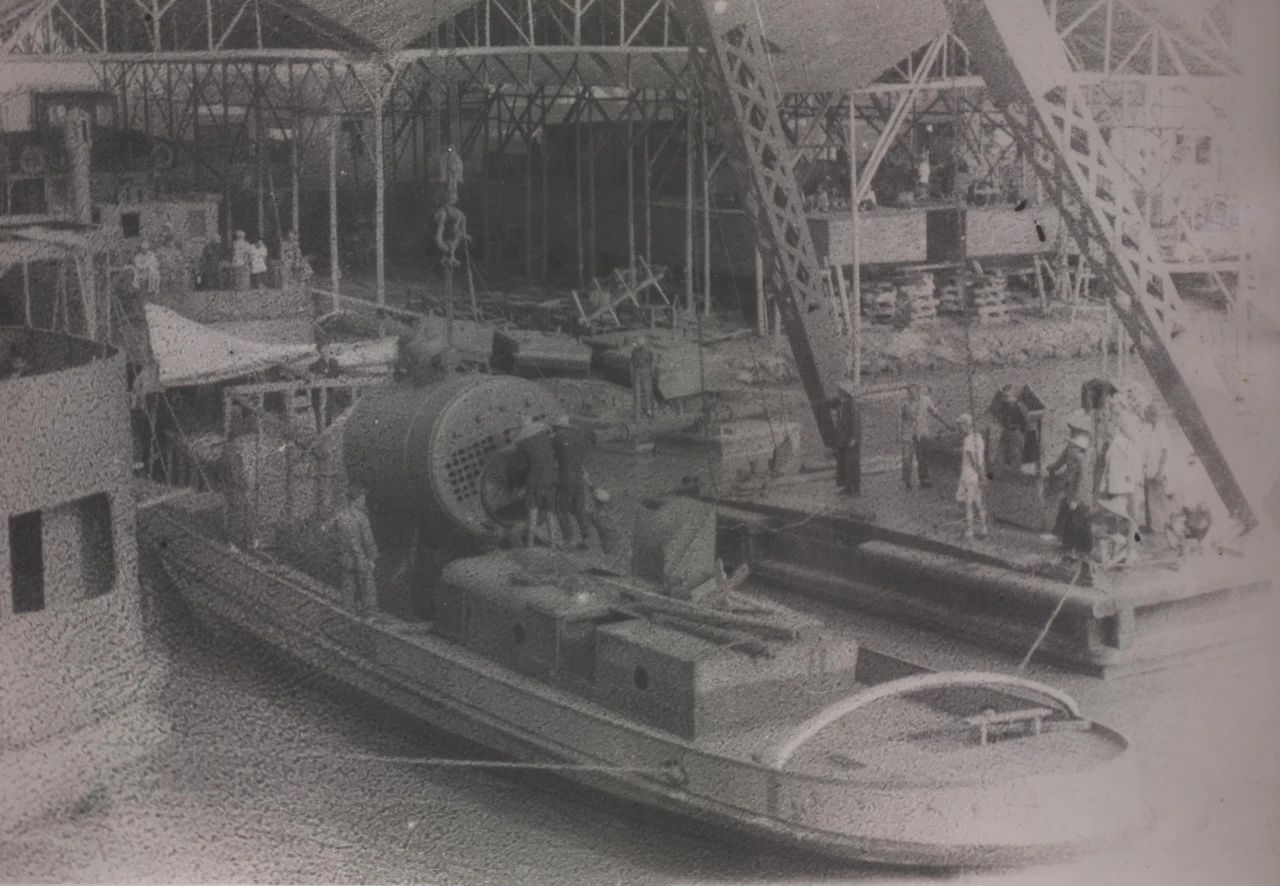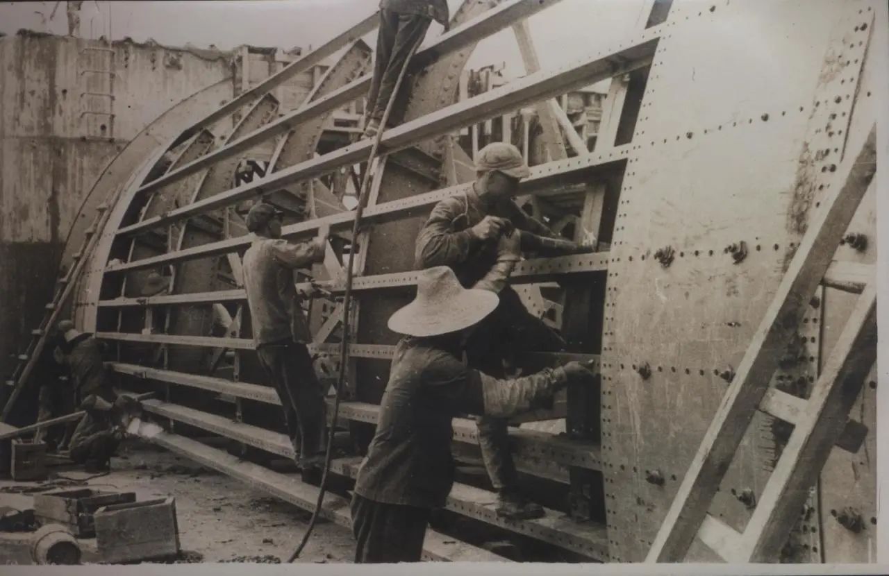 1934年武漢,上世紀(jì)30年代,武昌造船成立之初,工人們以手工作業(yè)“敲敲打打”形式開展修造船業(yè)務(wù)。修造的船只大多為100~300噸、鋼肋骨與木殼結(jié)構(gòu),僅有少量是鋼鉚接船體。建造的船只只能在長(zhǎng)江上航行跑跑運(yùn)輸。為了生存和救國(guó),船廠還建造一些農(nóng)用機(jī)械器具、槍支,以輔助民生、支援抗日。