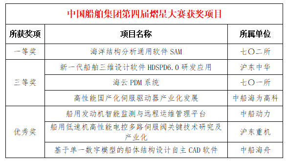 2025年1月3日,國(guó)務(wù)院國(guó)資委正式公布第四屆中央企業(yè)熠星創(chuàng)新創(chuàng)意大賽獲獎(jiǎng)名單。中國(guó)船舶集團(tuán)參賽項(xiàng)目榮獲一等獎(jiǎng)1項(xiàng)、三等獎(jiǎng)3項(xiàng)、優(yōu)秀獎(jiǎng)3項(xiàng),優(yōu)秀導(dǎo)師4名,集團(tuán)公司榮獲“優(yōu)秀組織單位”榮譽(yù)稱號(hào)。