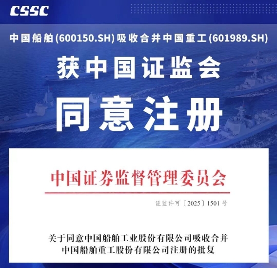 7月18日,中國證監(jiān)會發(fā)布《關(guān)于同意中國船舶工業(yè)股份有限公司吸收合并中國船舶重工股份有限公司注冊的批復(fù)》,同意中國船舶工業(yè)股份有限公司換股吸收合并中國船舶重工股份有限公司。