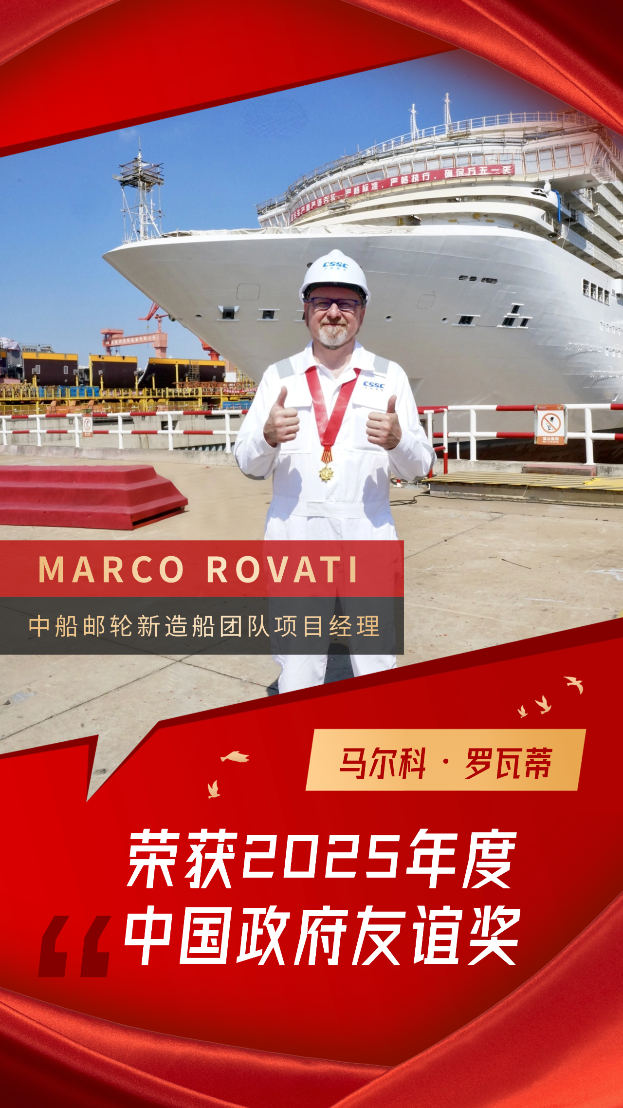 近日,2025年度中國政府友誼獎頒獎儀式在人民大會堂隆重舉行,國務(wù)委員諶貽琴為獲獎外國專家頒獎。中國船舶集團(tuán)有限公司旗下中船郵輪新造船團(tuán)隊(duì)項(xiàng)目經(jīng)理 MARCO ROVATI(馬爾科?羅瓦蒂),因在推動中國郵輪產(chǎn)業(yè)高質(zhì)量發(fā)展方面作出的突出貢獻(xiàn),榮獲此項(xiàng)國家級榮譽(yù)。