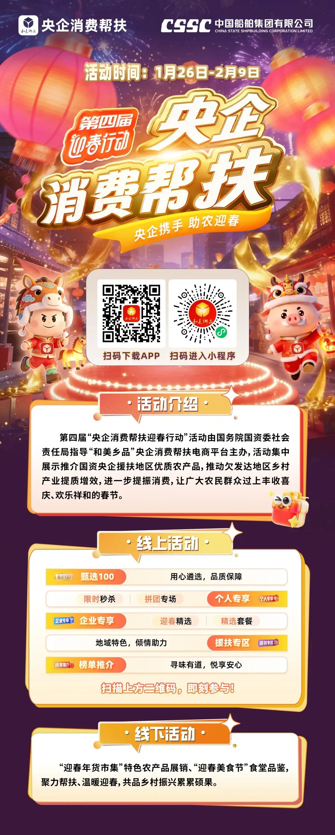 為深入貫徹黨中央、國務(wù)院關(guān)于消費幫扶的決策部署,落實國資委相關(guān)工作要求,中船集團積極組織參與2026“央企消費幫扶迎春活動”,以消費幫扶持續(xù)鞏固拓展脫貧攻堅成果、助力鄉(xiāng)村振興,鼓勵各單位及員工踴躍參與,推動幫扶地區(qū)群眾穩(wěn)定增收,讓廣大農(nóng)民群眾共享發(fā)展成果、歡度新春。