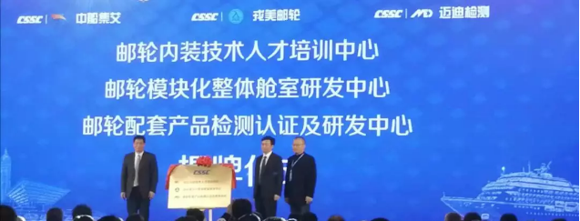 ????為解決我國郵輪配套產(chǎn)品認證難、艙室系統(tǒng)技術水平落后、專業(yè)人才匱乏等問題,在中船郵輪和中國船舶集團所屬中船九江海洋裝備(集團)有限公司的指導下,中國船舶集團所屬中船集艾郵輪科技發(fā)展(上海)有限公司聯(lián)合中國船級社和上海工程技術大學成立了《郵輪配套產(chǎn)品測試認證及研發(fā)中心》、《郵輪模塊化整體艙室研發(fā)中心》和《郵輪內裝技術人才培訓中心》,并在會上正式揭牌。
