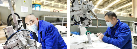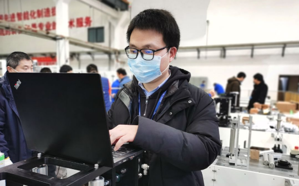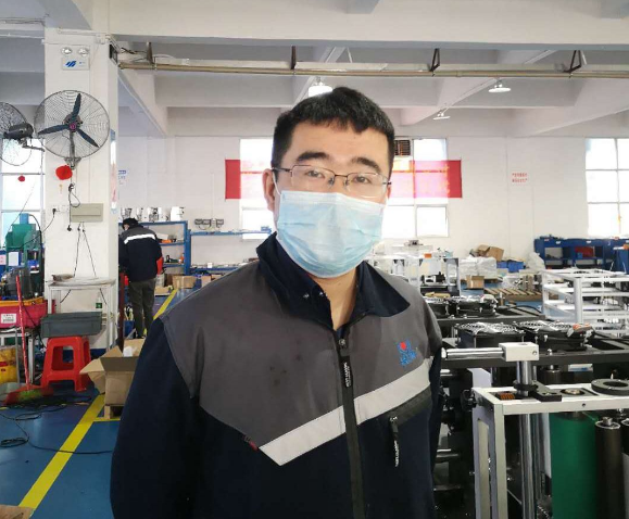 ????徐存培是平面口罩機項目的技術(shù)負責(zé)人。自接到平面口罩機研制任務(wù)以來,他幾乎就“長”在公司里了。他穿梭在各臺平面口罩機間,一會兒墊腳測量放料架距離地面的高度,一會兒彎腰擰緊設(shè)備柜里的螺絲,一會兒又緊盯著傳送帶,看無紡布貼合的角度是否精準(zhǔn)無誤……