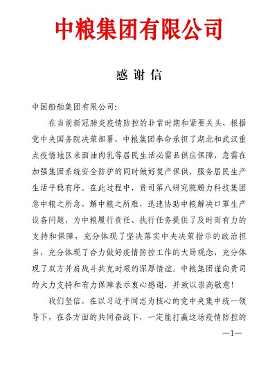 ????在這場戰(zhàn)“疫”中,中國船舶集團(tuán)沒有缺席——所屬八院鵬力科技集團(tuán)緊急承擔(dān)平面口罩機(jī)、N95口罩機(jī)、壓條機(jī)等醫(yī)療物資生產(chǎn)關(guān)鍵設(shè)備研制攻關(guān)任務(wù),以“戰(zhàn)時速度”硬核抗疫。近日,中國石油、中糧集團(tuán)、中國誠通集團(tuán)等,紛紛發(fā)來感謝信,對鵬力科技集團(tuán)的全力支持表達(dá)深深的謝意。