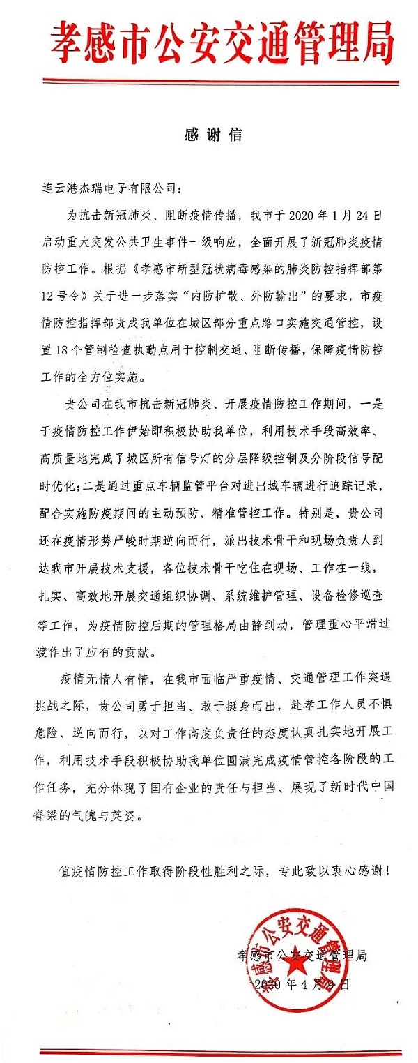 ????中國船舶集團(tuán)七一六所下屬杰瑞電子公司收到湖北省孝感市公安交通管理局發(fā)來的感謝信,對(duì)杰瑞電子赴孝感工作人員不懼危險(xiǎn)、逆向而行,以高度負(fù)責(zé)任的態(tài)度,利用技術(shù)手段,積極協(xié)助疫情防控工作表示感謝。