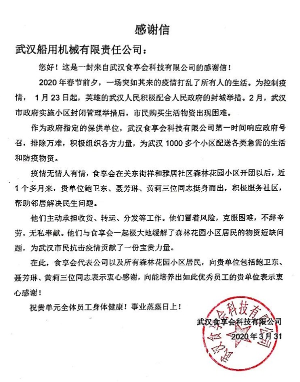 ????中國船舶集團(tuán)旗下武漢船機(jī),收到武漢食享會(huì)科技公司發(fā)來的感謝信,信中對(duì)武漢船機(jī)員工挺身而出,主動(dòng)擔(dān)任武漢社區(qū)志愿者不畏艱險(xiǎn)、無私奉獻(xiàn),為抗擊疫情貢獻(xiàn)力量表示敬佩和感謝。