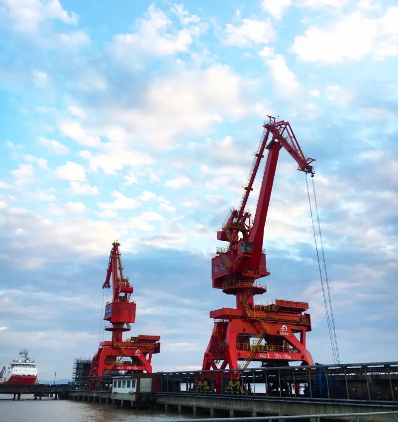 ????近日,武漢船機(jī)海西重機(jī)為寧波舟山港老塘山碼頭打造的2臺(tái)25T-36M四連桿帶斗門機(jī)順利交付。門機(jī)額定起重量25噸,工作幅度36米,額定工作效率800噸/時(shí),主要用于煤炭和海沙的卸船作業(yè)。