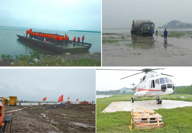 ????在搜救環(huán)節(jié),中船應急搶險隊架設動力舟橋和硬質(zhì)機動路面進行道路搶通,保障重型裝備及人員進場;在內(nèi)澇搶排環(huán)節(jié),采用應急泄流虹吸裝備和履帶式排澇機器人參與排澇搶險;在重大險情處置環(huán)節(jié),鋪設應急直升機停機坪保障直升機起降,并實施潰口封堵作業(yè)。