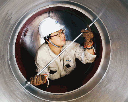 上海船院質(zhì)量檢測(cè)工程師正在檢測(cè)扭曲舵套筒。該扭曲舵由上海船院研發(fā)設(shè)計(jì),將用于黃埔文沖在建的2700TEU集裝箱船。