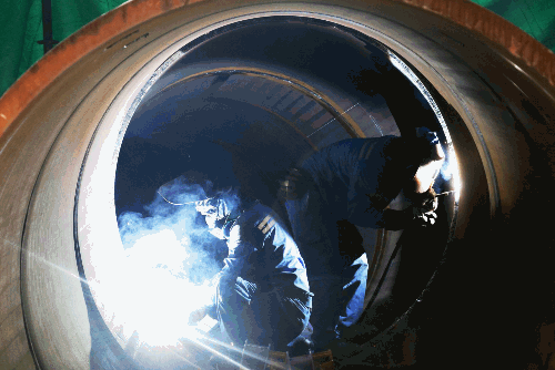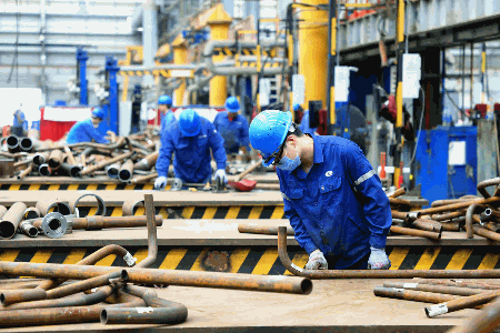 廣船國(guó)際首個(gè)吸力筒導(dǎo)管架風(fēng)機(jī)基礎(chǔ)施工現(xiàn)場(chǎng),技術(shù)工人正在進(jìn)行管子焊接作業(yè)。