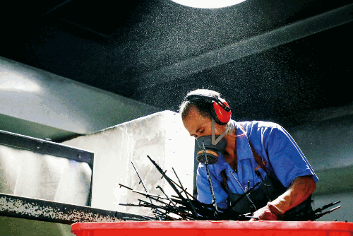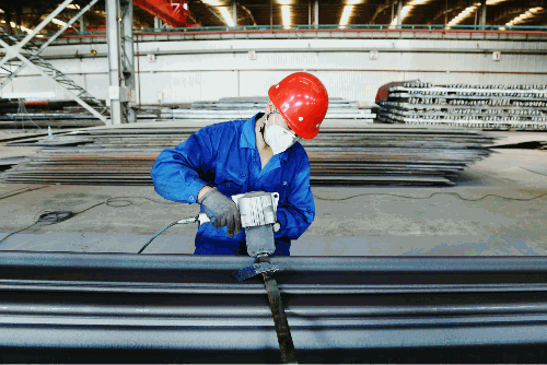物資公司下屬鞍山公司預(yù)處理車(chē)間現(xiàn)場(chǎng),中午最高可達(dá)40°C,工作人員正在進(jìn)行型材預(yù)處理作業(yè),保質(zhì)保量完成物資供應(yīng)。