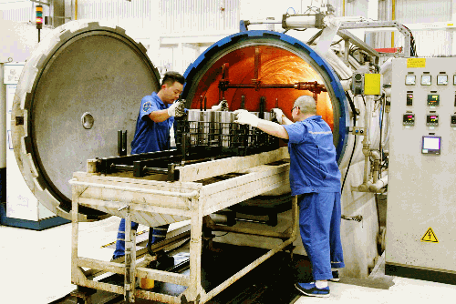 淬火的爐旁,氣溫高達(dá)50°C。重慶紅江操作師傅嫻熟地將工件從爐內(nèi)拉出,吊裝到指定工位進(jìn)入下道工序,再裝上另一批產(chǎn)品入爐,繼續(xù)進(jìn)行熱處理。