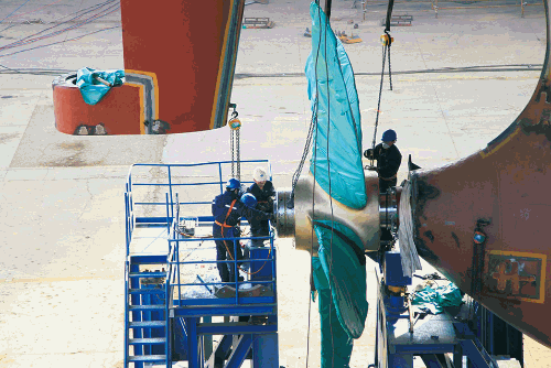 大船集團(tuán)山船重工塢內(nèi)施工現(xiàn)場(chǎng),鉗工正在進(jìn)行螺旋槳安裝工作,為后續(xù)該船按期出塢打下基礎(chǔ)。