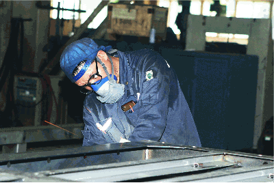 中船應(yīng)急電焊工正在進(jìn)行電焊加工,全然無覺后背濕了大片。