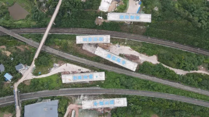 此次轉(zhuǎn)體的五段橋梁梁體為重慶新建快速路二橫線(xiàn)物流園區(qū)至禮白立交工程跨渭井、蔡歌聯(lián)絡(luò)線(xiàn)鐵路主線(xiàn)橋。