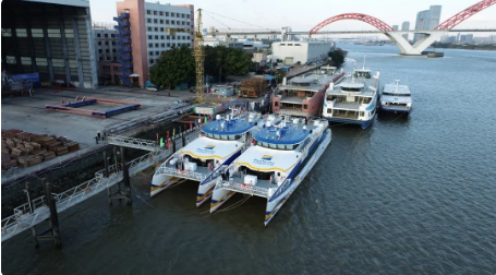 2020年12月30日,中國船舶集團旗下遠舟公司所屬英輝南方造船(廣州番禺)有限公司建造的“新海韻”號、“新海駿”號兩艘鋁合金雙體高速客船,同時在廣州市番禺區(qū)英輝南方碼頭順利交付?!靶潞m崱?、“新海駿”是英輝南方為船東建造的藍色干線系列高速客船的第8和第9艘,船長42.8米,寬10.3米,載客199人,設(shè)計航速35節(jié)。遠舟公司所屬英輝南方在鋁合金高速客船第三代船型基礎(chǔ)上,開展技術(shù)創(chuàng)新和船型優(yōu)化,開發(fā)完成了“新海韻”、“新海駿”為代表的第四代新船型。