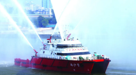 2010年12月28日,廣船國(guó)際為南沙區(qū)建造的“南沙號(hào)”消防船投入使用?!澳仙程?hào)”消防船總長(zhǎng)46米,型寬15米,排水量達(dá)到680噸,航速可達(dá)32.4公里/小時(shí),共設(shè)置有6門(mén)水炮。其中,2門(mén)主炮射程可達(dá)到150米,4門(mén)副炮射程可達(dá)到130米;還設(shè)置了全船水幕保護(hù)系統(tǒng),在火災(zāi)現(xiàn)場(chǎng)可有效保護(hù)自身安全。“南沙號(hào)”消防船是當(dāng)時(shí)國(guó)內(nèi)最大雙體專勤消防船,大大增強(qiáng)了對(duì)船舶火災(zāi)、石化碼頭、油庫(kù)火災(zāi)的撲救能力。