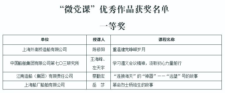 除一等獎的“微黨課”作品,其他獲評優(yōu)秀的“微黨課”和專題黨課可以登錄集團公司黨?!爸写琫學”平臺首頁“中國船舶集團有限公司黨課評選優(yōu)秀作品展示”進行觀看。