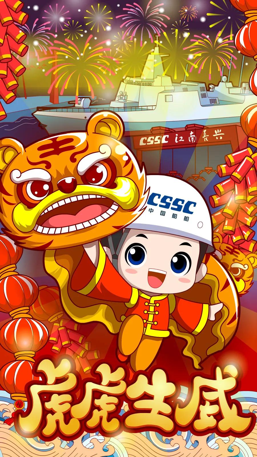海報采用國潮畫風,中間部分“江小南”穿著新衣舉著虎頭,寓意新的一年中國船舶人虎虎生威,上面部分以重要產(chǎn)品和廠區(qū)設備為主,詮釋江南造船建造國之重器的初心和使命,同時輔以鞭炮、煙花、燈籠等新年元素,使海報充滿喜慶祥和的新年氛圍。