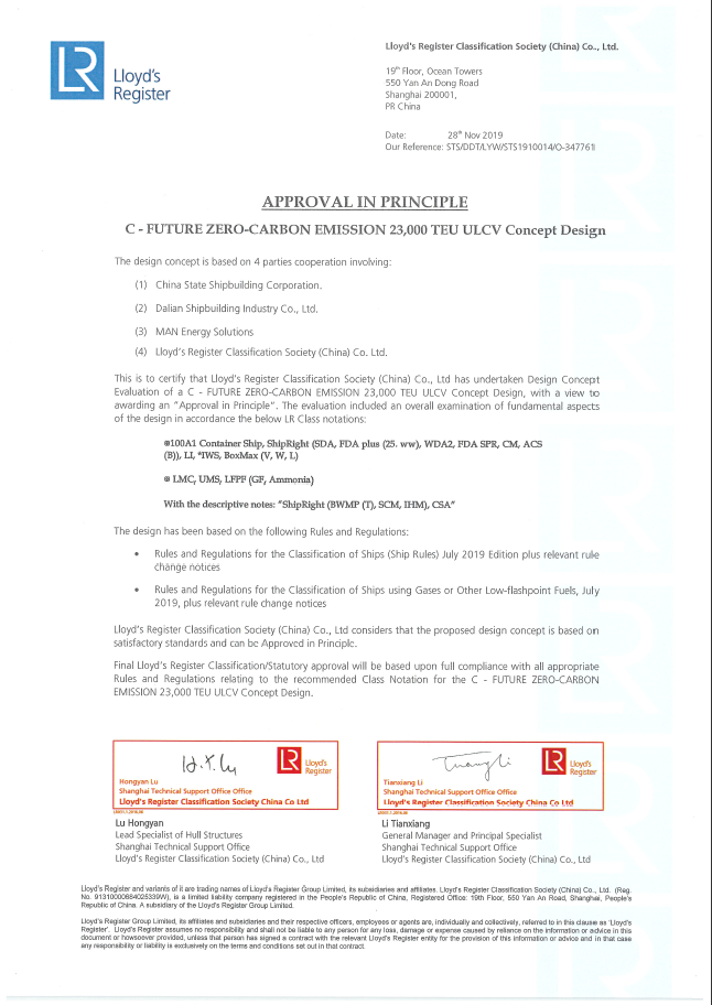 2月25日,中國(guó)船舶集團(tuán)旗下大船集團(tuán)最新研發(fā)的液氨動(dòng)力21萬噸散貨船設(shè)計(jì)方案,獲英國(guó)勞氏船級(jí)社(LR)原則性認(rèn)可(AIP)證書。