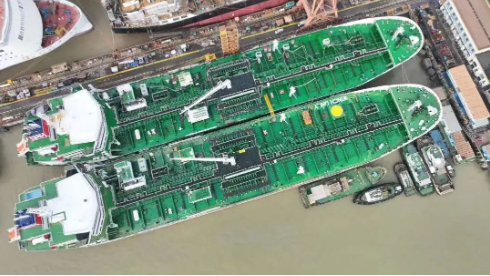 中國船舶集團旗下廣船國際建造的國內(nèi)首型甲醇雙燃料動力船2艘姊妹船肩并肩!