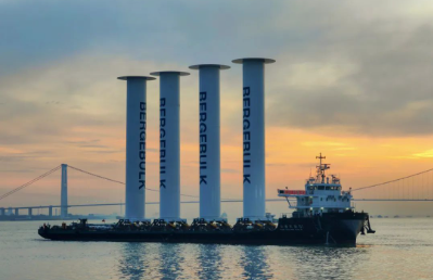 由中船澄西為Anemoi Marine Technologies公司建造的4套35米折疊式船用轉(zhuǎn)子帆,將安裝在一艘388000載重噸Valemax型礦砂船上,可以從垂直方向降低可折疊旋筒風(fēng)帆,以減輕對氣流和貨物裝卸操作的影響。