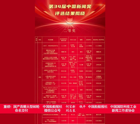11月7日,中華全國新聞工作者協(xié)會主辦的第34屆中國新聞獎(jiǎng)評選結(jié)果揭曉。中國國防科技工業(yè)新聞工作者協(xié)會推薦中國船舶報(bào)社特約記者何寶新、記者劉志良主創(chuàng)、錢平編輯的作品《重磅!國產(chǎn)首艘大型郵輪命名交付》獲消息類二等獎(jiǎng)。