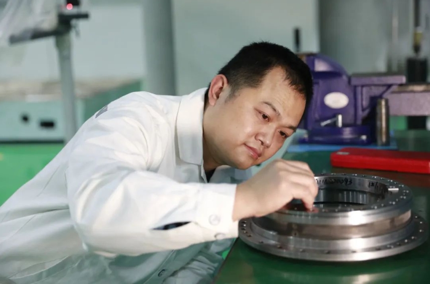 “必須持之以恒地以精益求精、精雕細(xì)琢的工匠精神打造所經(jīng)手的每個(gè)產(chǎn)品!”這是周虎常提的一句話。燃?xì)廨啓C(jī)機(jī)匣零組件制造精度要求高,裝配質(zhì)量控制嚴(yán),其加工、裝配工藝技術(shù)代表機(jī)械制造行業(yè)的先進(jìn)水平。武漢船機(jī)首套燃?xì)廨啓C(jī)機(jī)匣產(chǎn)品裝配工作由周虎帶領(lǐng)班組成員進(jìn)行,其高超的技能水平保障了產(chǎn)品的裝配質(zhì)量與進(jìn)度。在25兆瓦燃?xì)廨啓C(jī)過渡段機(jī)匣葉片裝配過程中,因葉片與機(jī)匣外環(huán)裝配為燕尾槽式的榫接結(jié)構(gòu),葉片榫頭與燕尾榫槽三面的接觸面積要求高達(dá)80%以上,需由鉗工拂配以達(dá)該指標(biāo)。葉片榫頭拂配過程中,周虎采用銼刀銼削裝配面,利用其長期磨練掌握的良好手感,將銼削量誤差控制在0.005-0.01毫米,大大減少了葉片試裝配次數(shù),裝配效率顯著提升。