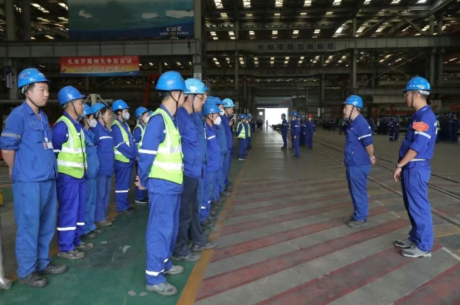 武昌造船、中船澄西、中船物資、中船動力和汾西重工等單位按照“五步法”召開班前會,確認(rèn)人員狀態(tài)及勞保防護裝備;分享安全案例,剖析隱患;細化工作任務(wù),標(biāo)注風(fēng)險,明確應(yīng)急流程;隨機抽查復(fù)述,組員互查要點;全員齊喊安全或精益口號,提振士氣。