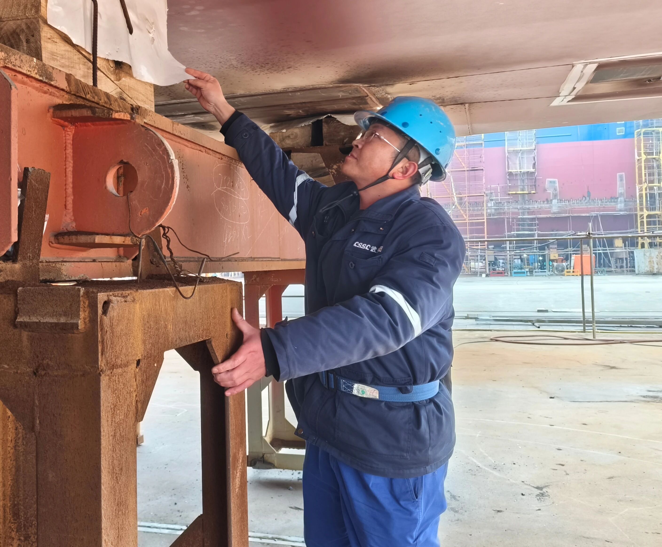 2025年7月3日上午,中國(guó)船舶集團(tuán)有限公司旗下武昌造船,某船臺(tái)安全通道附近。