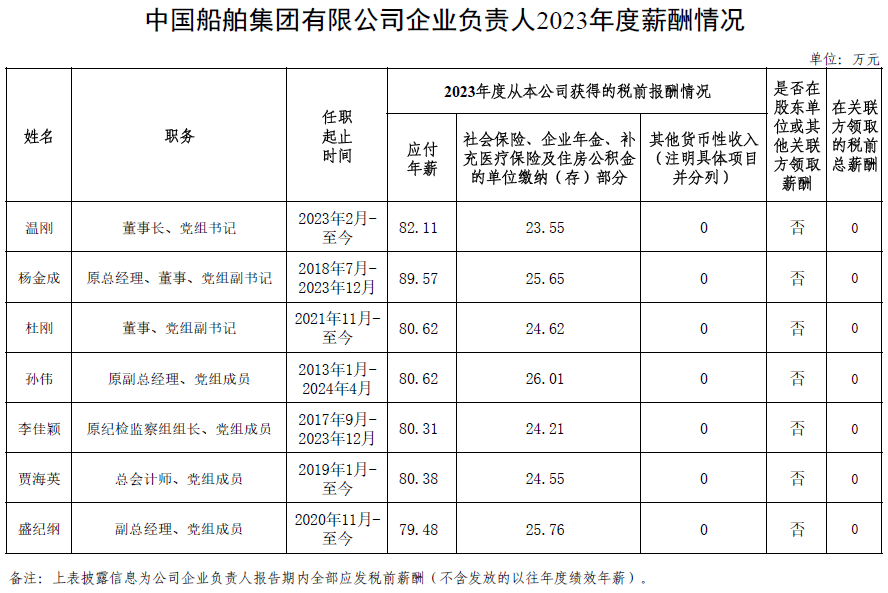 中國船舶集團有限公司企業(yè)負責人2023年度薪酬情況