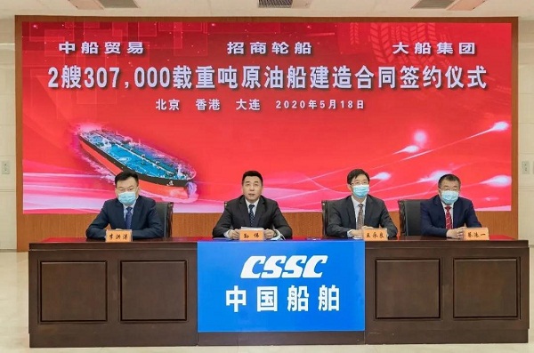 ????5月18日,中國船舶集團(tuán)旗下大船集團(tuán)、中船貿(mào)易與招商局集團(tuán)旗下招商輪船在北京、大連、香港三地以“云簽約”方式簽署2艘30.7萬載重噸原油船建造合同。中國船舶集團(tuán)副總經(jīng)理孫偉、招商局集團(tuán)副總經(jīng)理王宏、招商輪船董事長謝春林出席簽約儀式,中船貿(mào)易董事長李洪濤、大船集團(tuán)總經(jīng)理楊志忠、招商輪船總經(jīng)理王永新代表各方在建造合同上簽字。