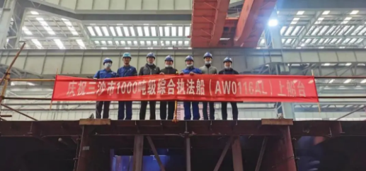 ????這是三沙市1000噸級綜合執(zhí)法船首制分段上船臺,武船集團僅用12個工作日就保質(zhì)保量完成了首制分段的制造及全部預舾裝工作。