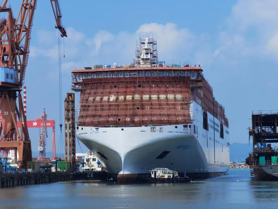 該船實(shí)現(xiàn)了出塢前上建亮燈。電纜拉放完成率87.8%,作為全球最大的豪華客滾船,該船全船電纜長度達(dá)到了946公里(相當(dāng)于從廣州到重慶);出塢前已完成了830公里電纜的拉放工作。涂裝完整性實(shí)現(xiàn)突破,該船出塢時(shí)上層建筑上方仍有部分區(qū)域未完成涂裝? 這是因?yàn)樵摯怪备叨纫呀咏?0米,超過了船塢高空車的最大極限。